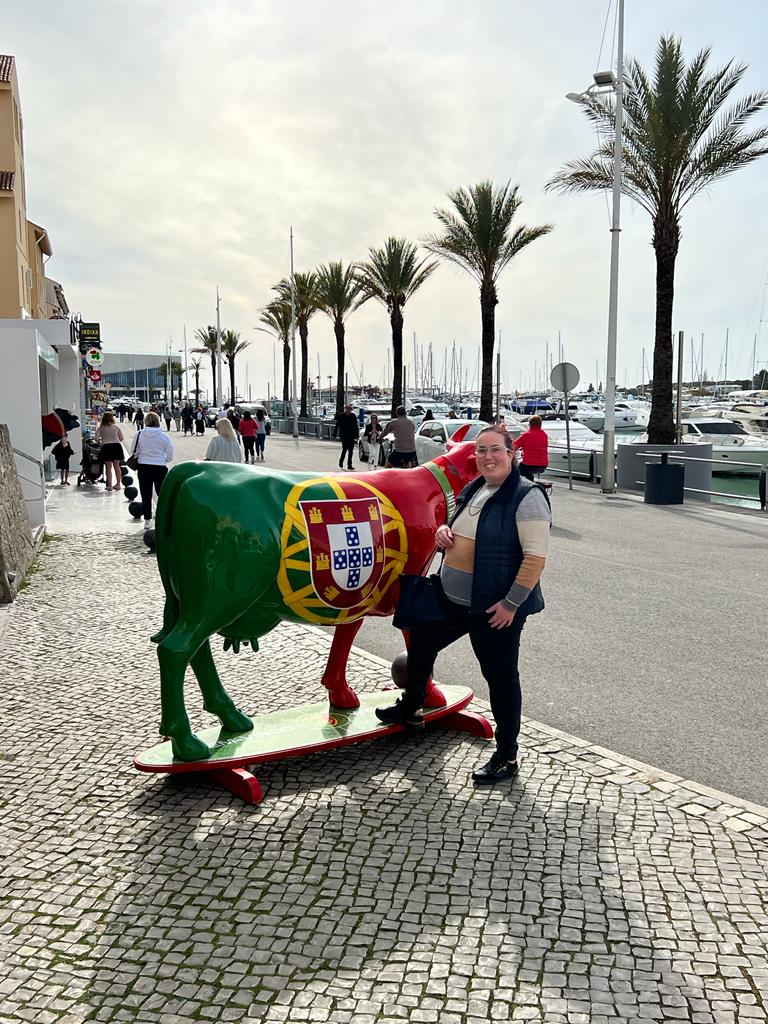 - Roupa Plus-Size: blusa de malha com riscas horizontais de várias cores, calças de fazenda justas cinzentas escuras, sapatilhas clássicas de pele pretas e douradas e colete preto impermeável.